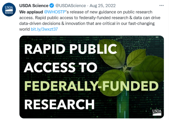 Similarly, the USDA tweeted their support for the guidance, noting that “rapid public access to federally-funded research & data can drive data-driven decisions & innovation that are critical in our fast-changing world.”