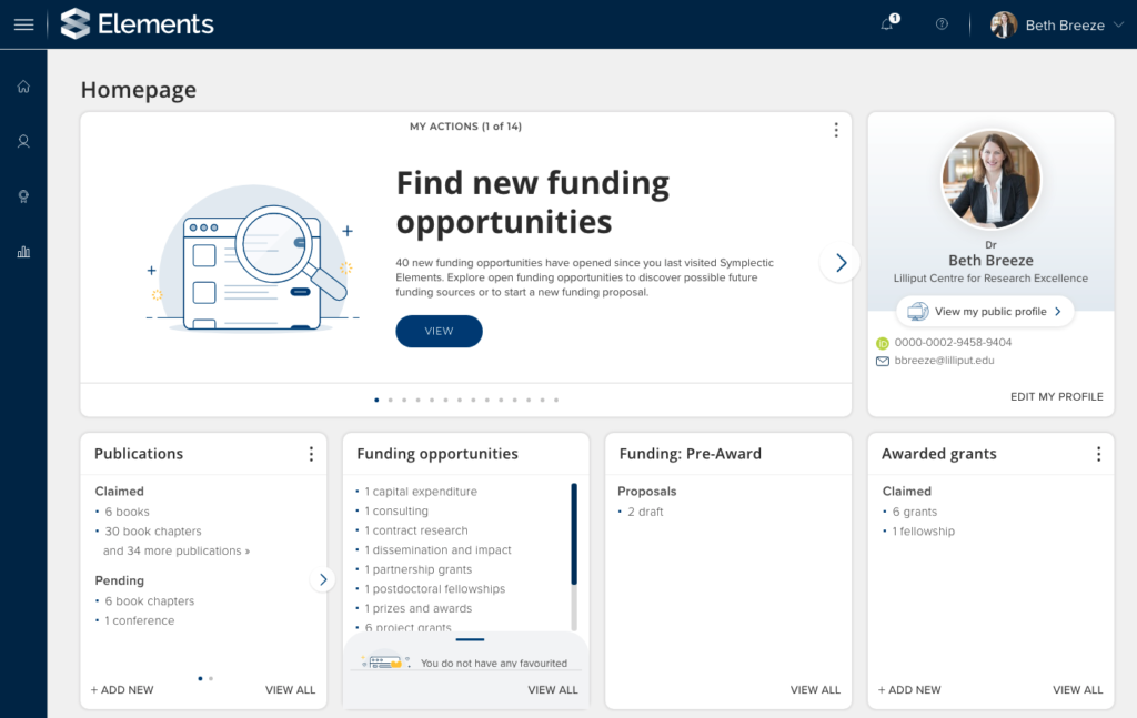 Symplectic Elements is designed to manage the full funding lifecycle: helping universities promote relevant funding opportunities, supporting researchers during the proposal development phase, streamlining internal reviews and approvals, and managing post-award activities and reporting.
