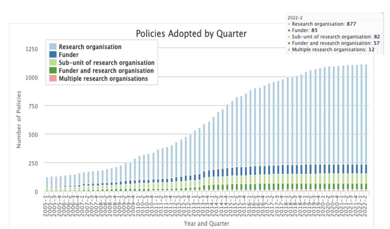 Chart 1 below shows a dramatic 10x increase of OA policies adopted between 2005 and 2022 by institutions, according to ROARMAP. Numbers of policies adopted by funders increased from 19 in 2005 to 142 to 2022. We are excited to see the growing effort in making research more open – but on the other hand, as research organisations are required to give account of how the funded projects are compliant and managed efficiently, we now are faced with a much bigger range of requirements and criteria to monitor within Symplectic Elements.